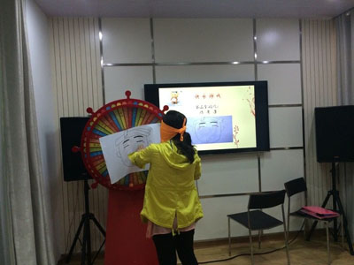 第三个《贴鼻子》游戏是个新游戏。在两位主持的恶趣味下,游戏被加了猛料:要蒙上眼睛先在原地转10个圈才能去给转盘上的人脸贴鼻子,第一个吃螃蟹的是周主任,不过兴致勃勃的他连转10圈后(实际被忽悠转了15圈)就找不着南北了,只见周主任一步一步慢慢的向前踱了过去,可离转盘方向偏了十万八千里,直接转到了观众席,同事们都笑趴了,大伙似乎嫌难度不够还一个劲的给他指错误方向,不过师傅毕竟是师傅,很快就认识到了自身位置,确立方向后直达终点,贴了第一个鼻子。第二个贴鼻子的是陈工,前人基础加上“上阵亲兄弟”的小高指点,基本顺顺当当的贴了鼻子。前两位上场的都是男同胞,女中豪杰李工也就被大伙儿推荐上台,不过女士的身体素质毕竟要差男士一些,转10圈后直接就晕了似喝醉酒一样的乱晃,郁总奚工等还嫌难度不够,偷偷把转盘上的人脸挪到了玻璃上,这可把李工郁闷坏了,好不容易摸到转盘发现人脸纸不见了,前摸摸,后摸摸,就差脑门上挂个问号:纸怎么没了?,老钱大概觉得良心过意不去,又想把纸张偷偷贴回去,却被乱摸的李工抓个正着.............,人赃并获之下帮奚工背了好大一口黑锅,可把大家乐坏了。