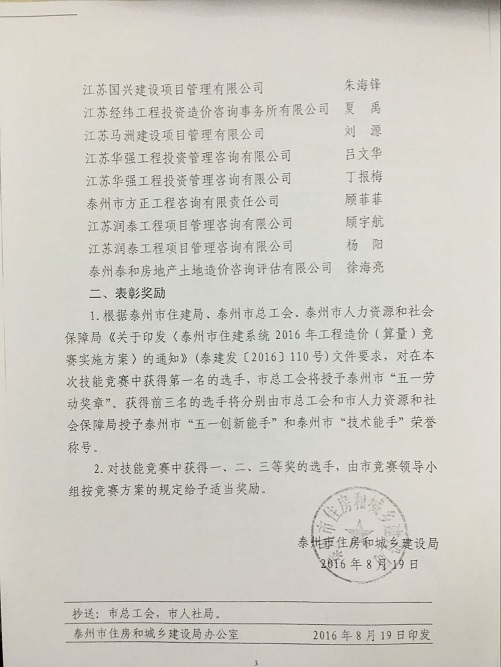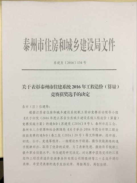 关于表彰泰州市住建系统2016年工程造价(算量)竞赛获奖选手的决定
