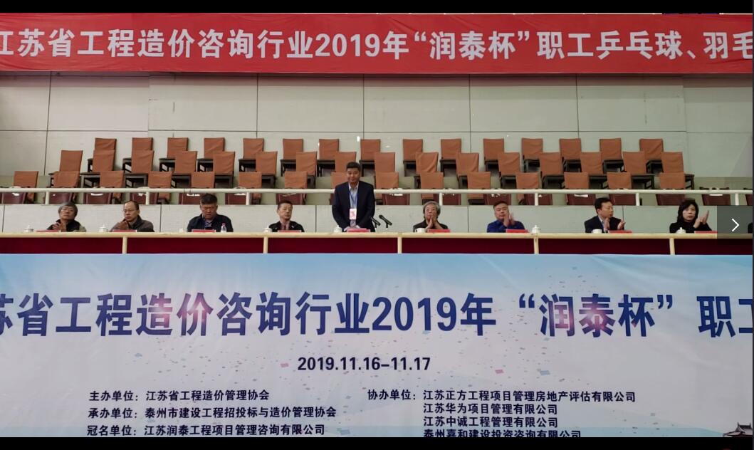 2019年1116,江苏省工程造价咨询行业 2019润泰杯职工羽毛球、乒乓球比赛开幕式在泰州市体育馆举行。江苏省工程造价管理协会王如三理事长、泰州市住房和城乡建设局孙建兴副局长、各市造价处及造价管理协会领导、江苏润泰工程项目管理咨询有限公司邵荣庆董事长等出席了此次比赛开幕仪式。首先由孙建兴副局长致欢迎词,其次是冠名单位致辞,最后由省协会王如三理事长宣布大赛开幕.