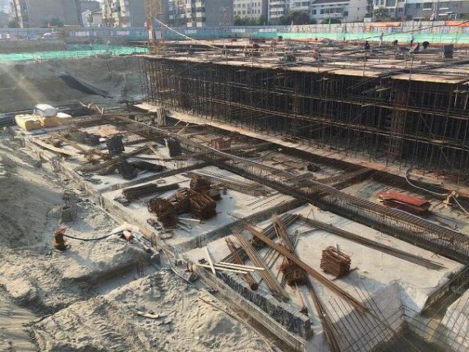 而该工程施工工艺则主要分以下10个流程:1、打试桩,经检验合格后,由设计单位调整工程桩设计。2、打工程桩,并进行相应的检测。3、A区基坑支护。4、分阶段布置井点降水。5、测量放线。6、挖土护坡。7、各方联合基坑验收。8、合格后做垫层挖梁槽,砌砖胎膜、抹灰做防水保护层。9、钢筋安装(提前一个月钢筋进场进行翻样制作)焊干板止水带、后浇带收口网。10、浇筑混凝土。