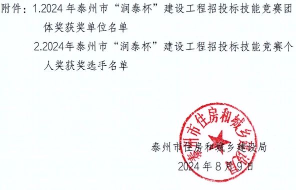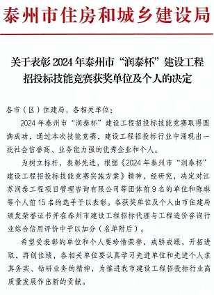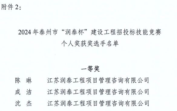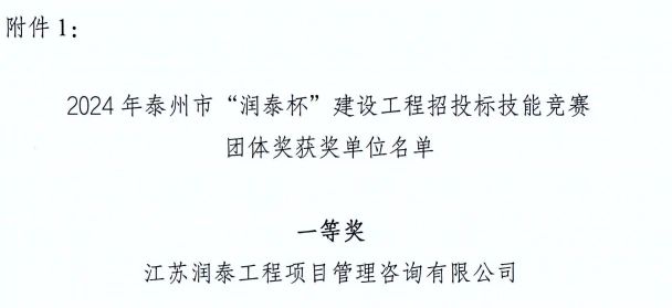 在这个充满挑战与机遇的时刻,我们无比激动地宣布:经过激烈的竞争与层层筛选,我司在刚刚结束的泰州市“润泰杯”建设工程招投标技能竞赛中,脱颖而出,荣获了万众瞩目的一等奖!成为泰州市唯一连续三年获得该荣誉的单位。这是对我们团队专业技能、创新思维和不懈努力的最高肯定,也是我们在建设工程领域又一次辉煌成就的见证!