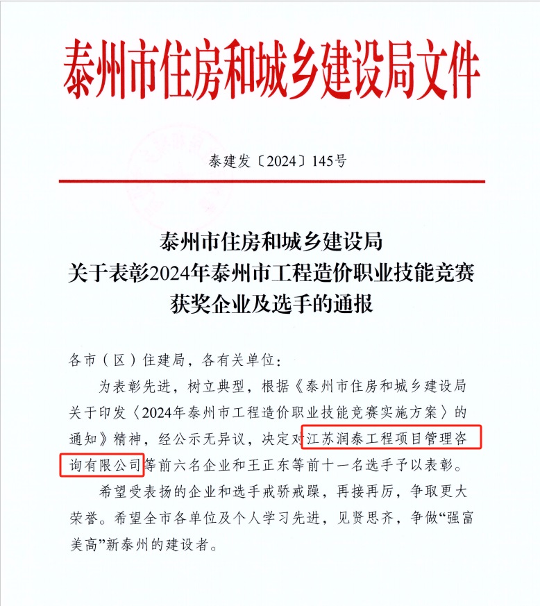 金秋时节,喜报频传。近日,2024年泰州市工程造价职业技能竞赛成绩揭晓,润泰咨询公司高原、沈杰、吴盼组成的团队获得团体第一名,高原、沈杰分获个人一等奖、二等奖。